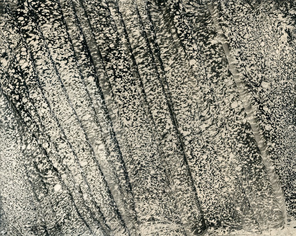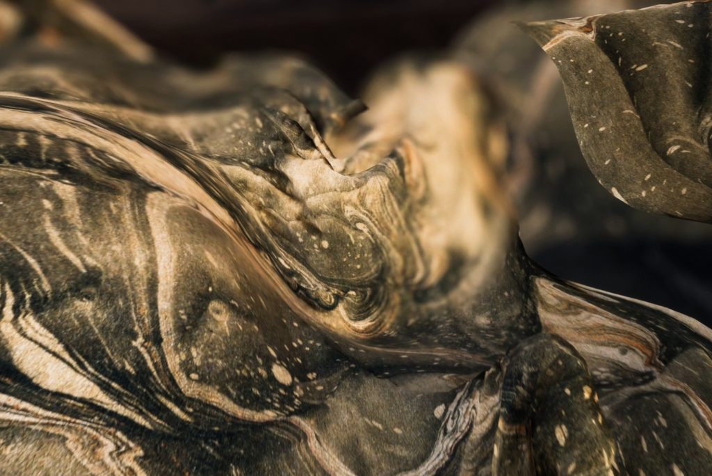 With her marbled papers Katarzyna Korzeniecka creates volatility, she fishes out moments. The ephemeral of a sheet of paper created with human gesture with a pattern that resembles deceptively a structure of a rock is closer to metaphysics of death than a stone.