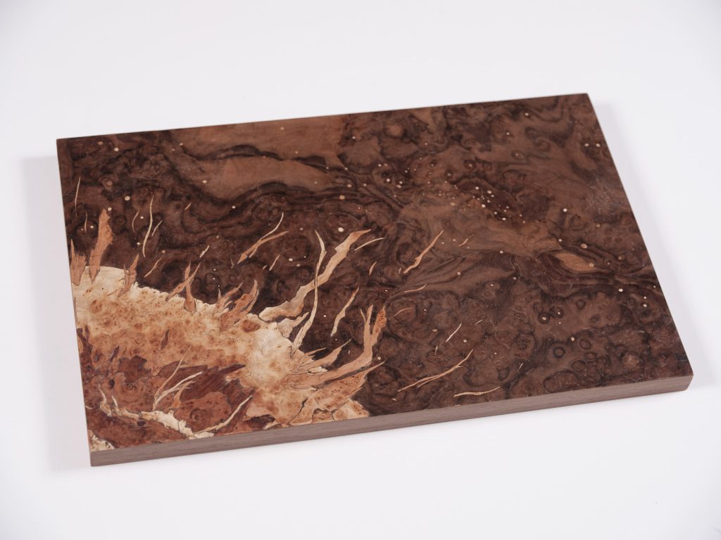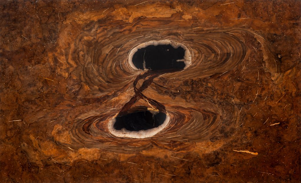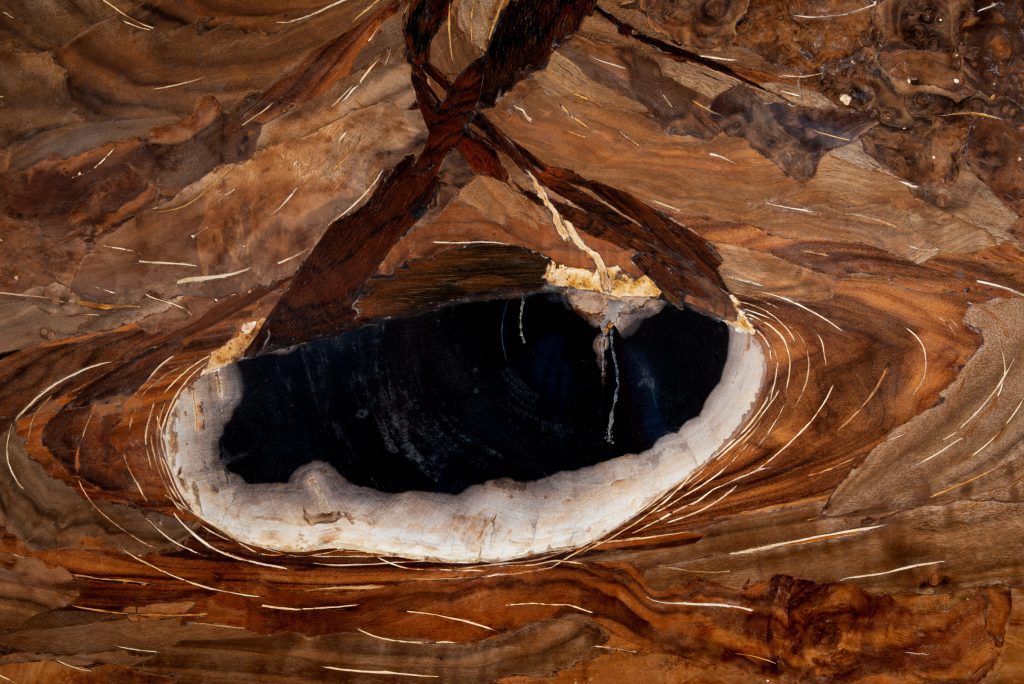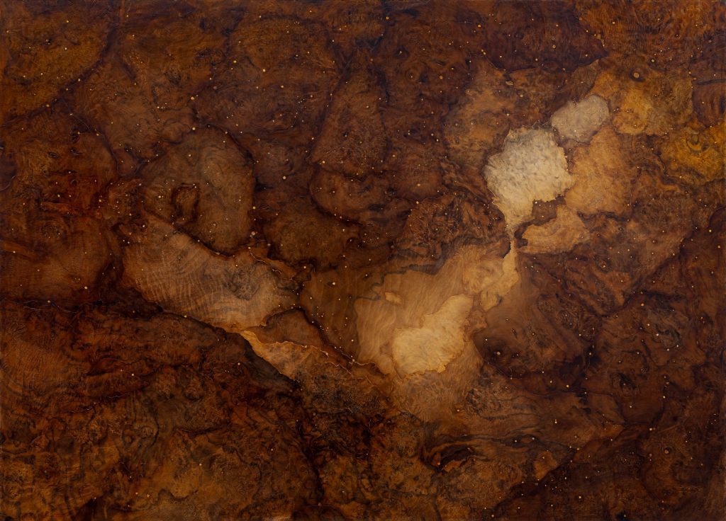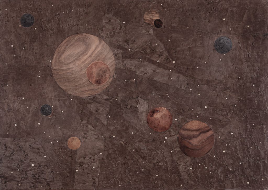 Works created using the marquetry technique represent an ontological narrative of the Universe. Composed of hundreds of small fragments of wood, they reveal the structures of the cosmos at various levels of reality. In every plant, we encounter infinite systems of tissues governed by the same physical laws as distant galaxies.