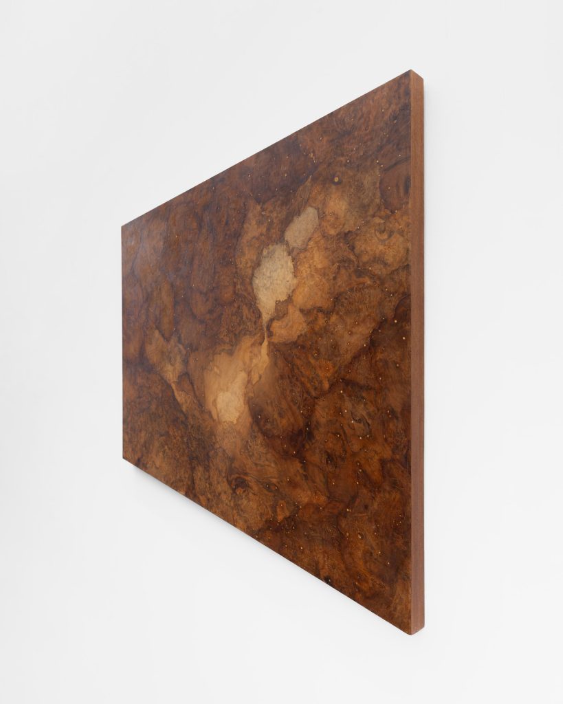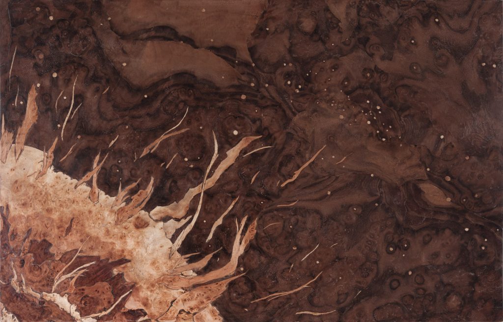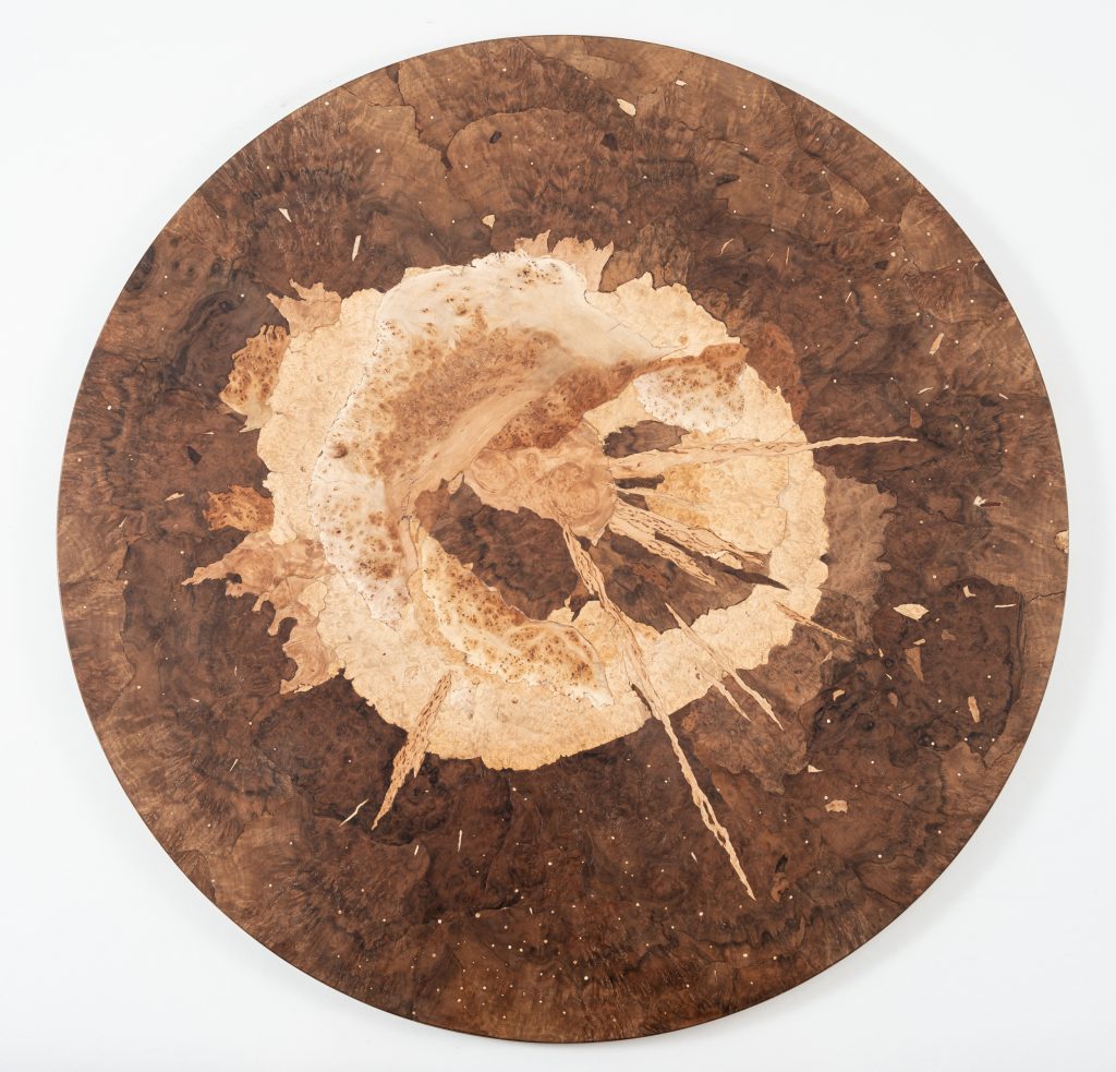 The marquetry series, created since 2011, simultaneously references the rich tradition of craftsmanship and explores the complexity of the Universe and its primordial structures on a metaphysical level.