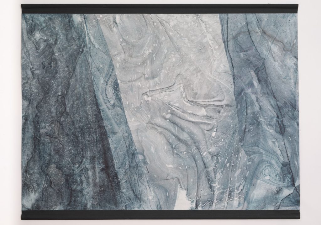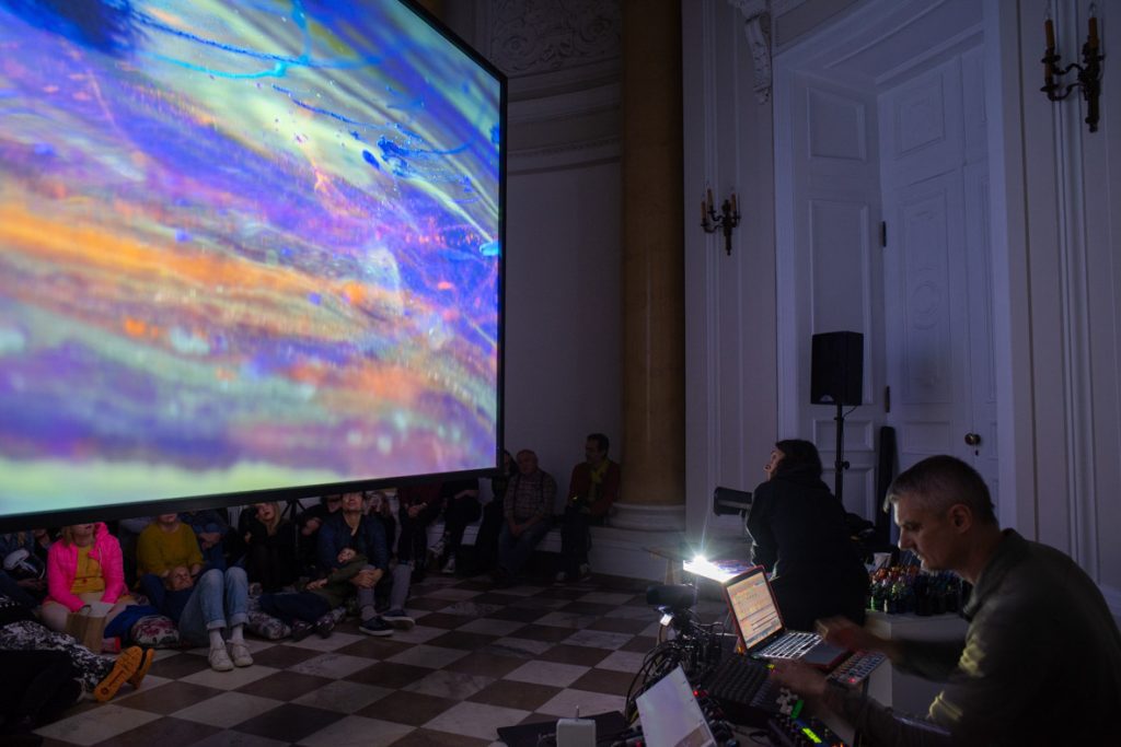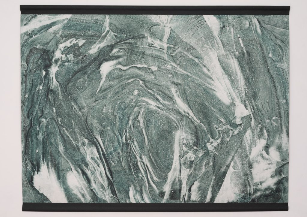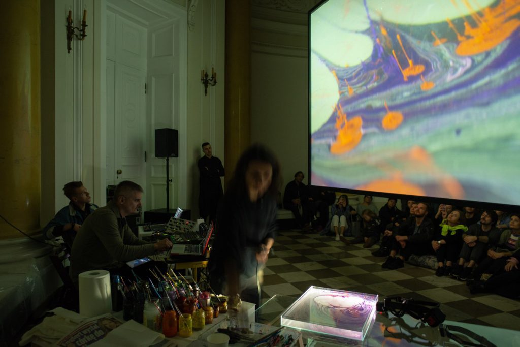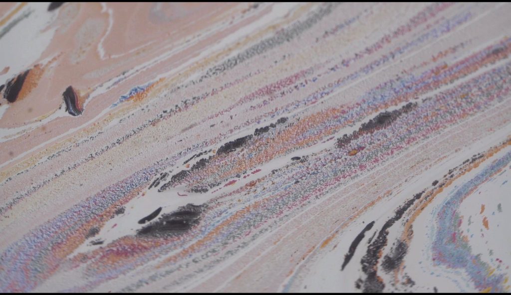 The exhibition In My Own Wave is the result of a collaboration between a visual artist and an electronic music composer. Katarzyna Korzeniecka (b. 1976) and Jacek Sienkiewicz (b. 1976) have merged their autonomous worlds of image and sound. In recent years, Katarzyna Korzeniecka’s main focus has been exploring bookbinding techniques and the centuries-old ebru technique. (…) Contemplative video coexists with Jacek Sienkiewicz’s sound installation, which incorporates musical pieces from his latest album IMOW. (…) The exhibition In My Own Wave is part of a long tradition of collaborations between visual artists and musicians, rooted in avant-garde experiments from Black Mountain College, Kantor’s informel, matter painting, and the dynamics of the living image. The unifying element remains the titular wave: sonic, visual, or literally aquatic.