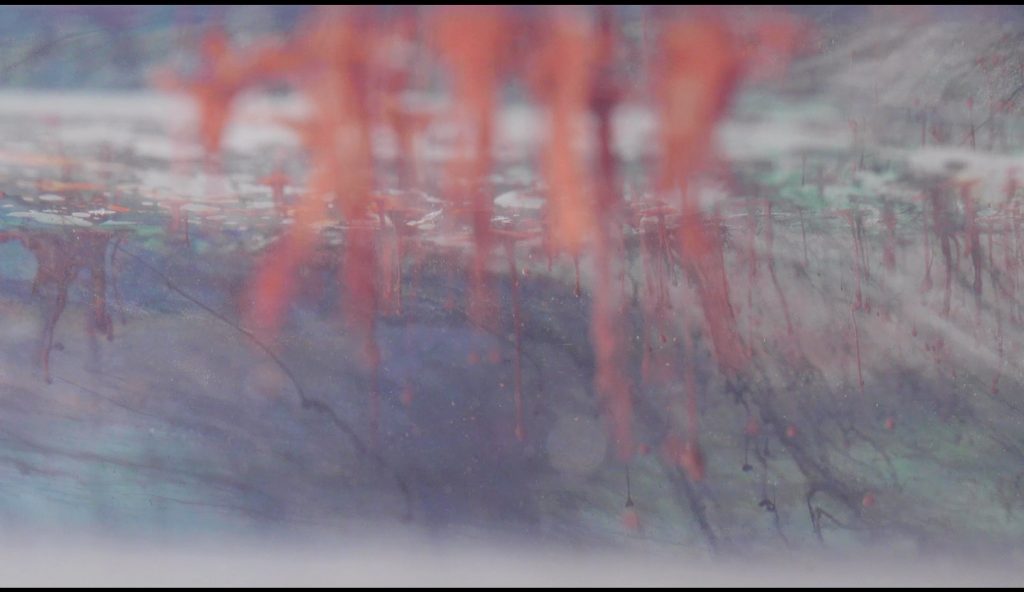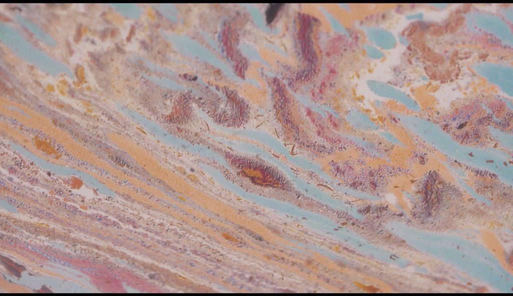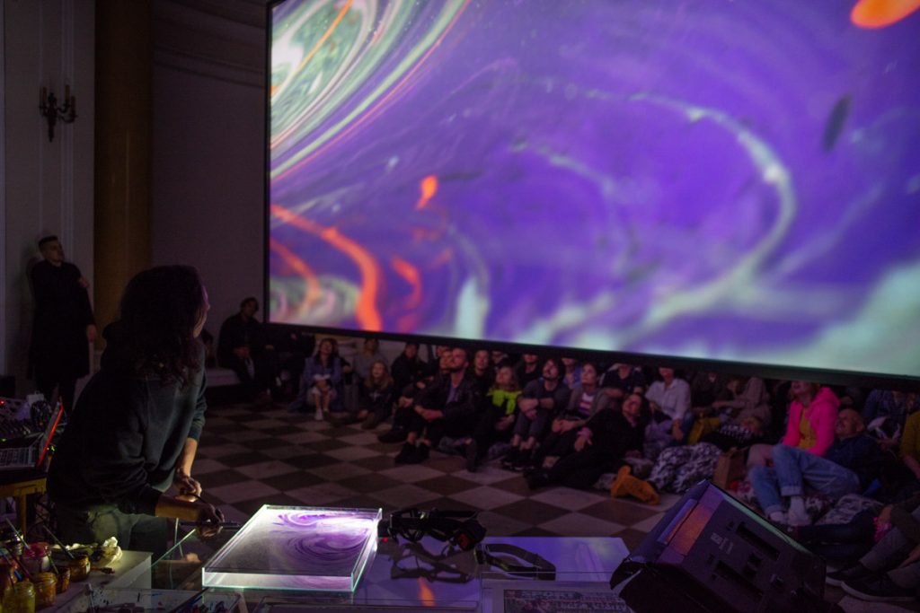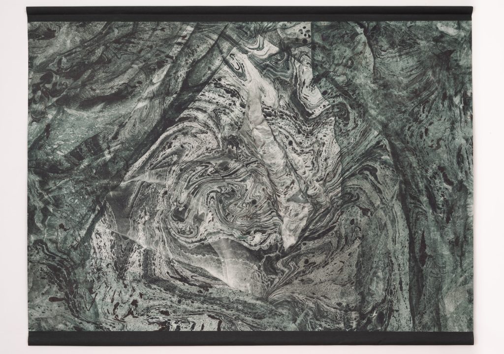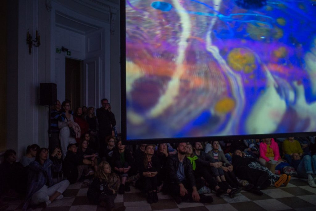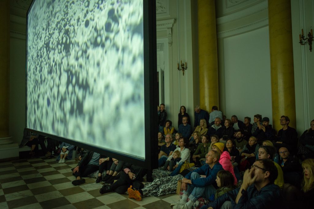 The exhibition In My Own Wave is the result of a collaboration between a visual artist and an electronic music composer. Katarzyna Korzeniecka (b. 1976) and Jacek Sienkiewicz (b. 1976) have merged their autonomous worlds of image and sound. In recent years, Katarzyna Korzeniecka’s main focus has been exploring bookbinding techniques and the centuries-old ebru technique. (…) Contemplative video coexists with Jacek Sienkiewicz’s sound installation, which incorporates musical pieces from his latest album IMOW. (…) The exhibition In My Own Wave is part of a long tradition of collaborations between visual artists and musicians, rooted in avant-garde experiments from Black Mountain College, Kantor’s informel, matter painting, and the dynamics of the living image. The unifying element remains the titular wave: sonic, visual, or literally aquatic.
